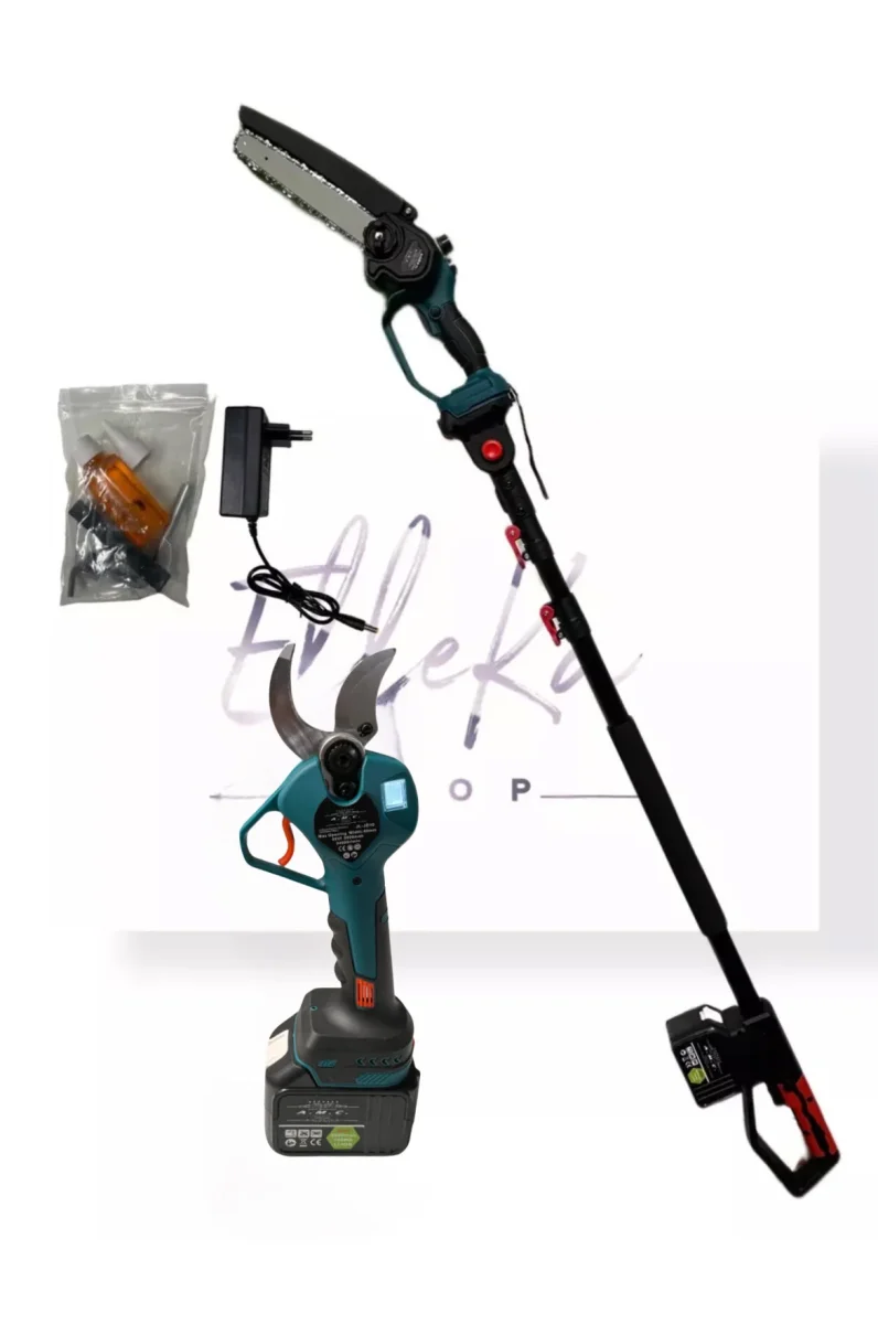 KIT POTATURA MINI MOTOSEGA 6″ + FORBICE CESOIA A BATTERIA CON ASTA TELESCOPICA