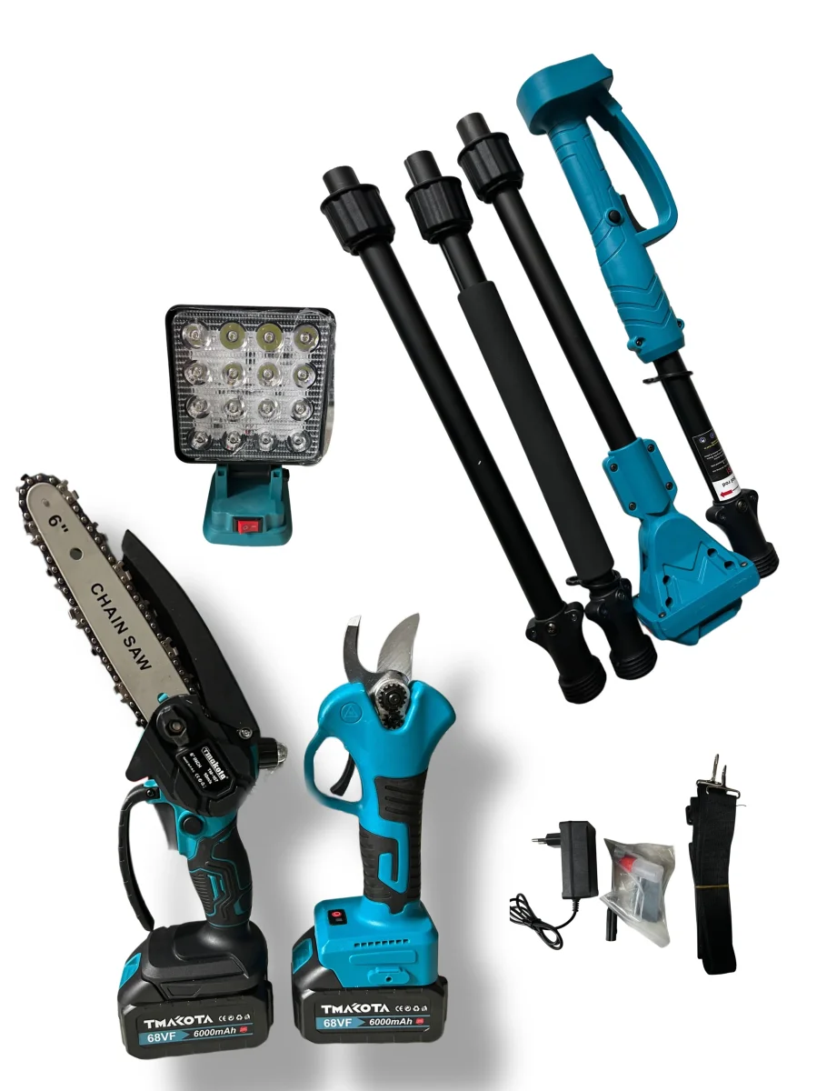 KIT POTATURA MOTOSEGA OLEATORE 6″ + CESOIA A BATTERIA CON ASTA TELESCOPICA SMONTABILE 240cm + TORCIA POWERBANK DOPPIA BATTERIA 68v 6000mAh