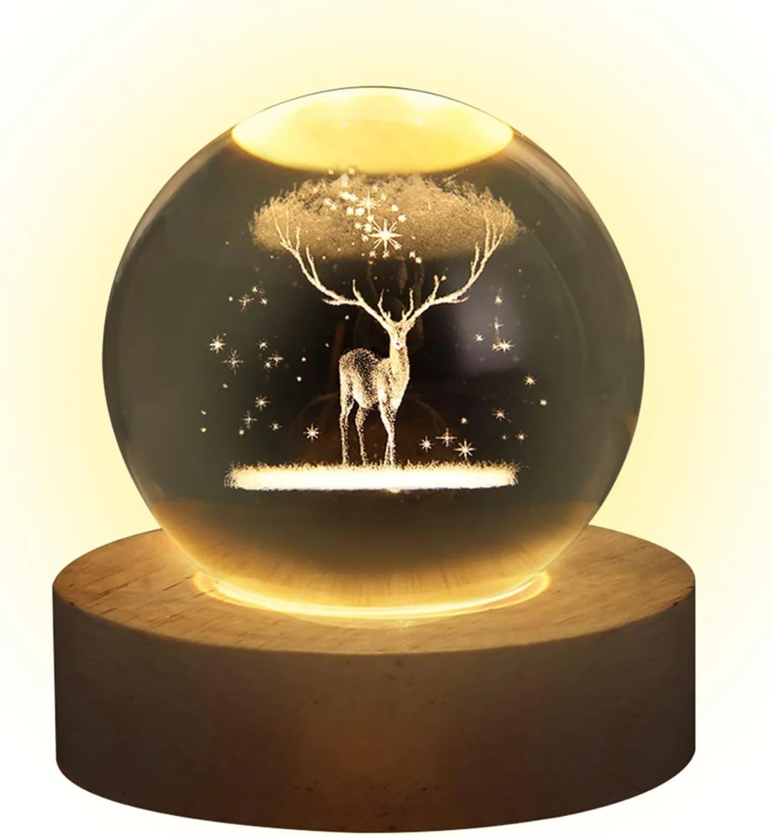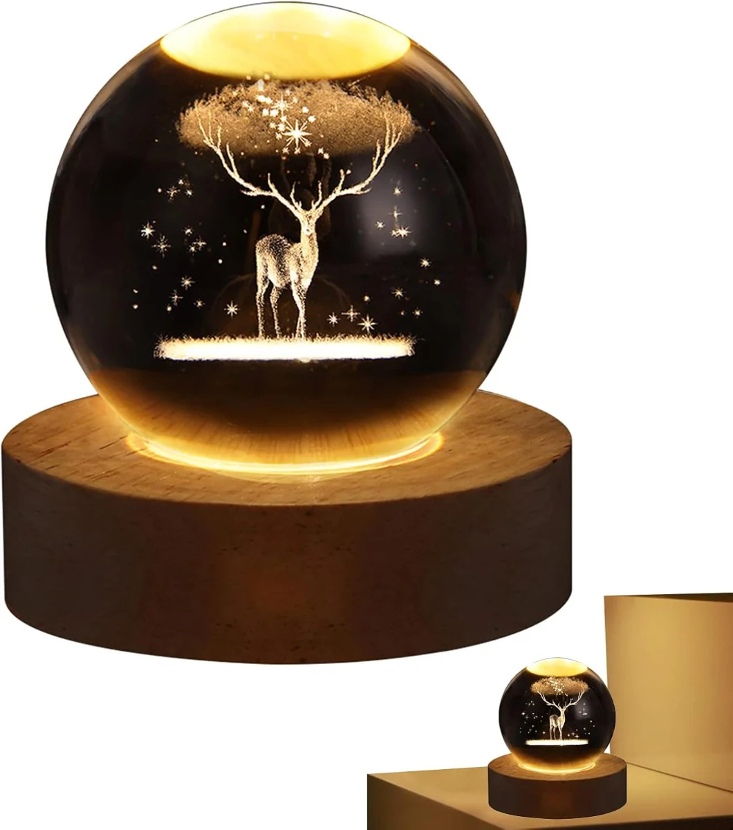 Questa elegante luce notturna 3D con sfera di cristallo è l’accessorio ideale per aggiungere un tocco di magia e serenità alla tua casa. Il design raffigura cervi immersi in una foresta incantata, donando un’atmosfera naturale e rilassante agli ambienti.