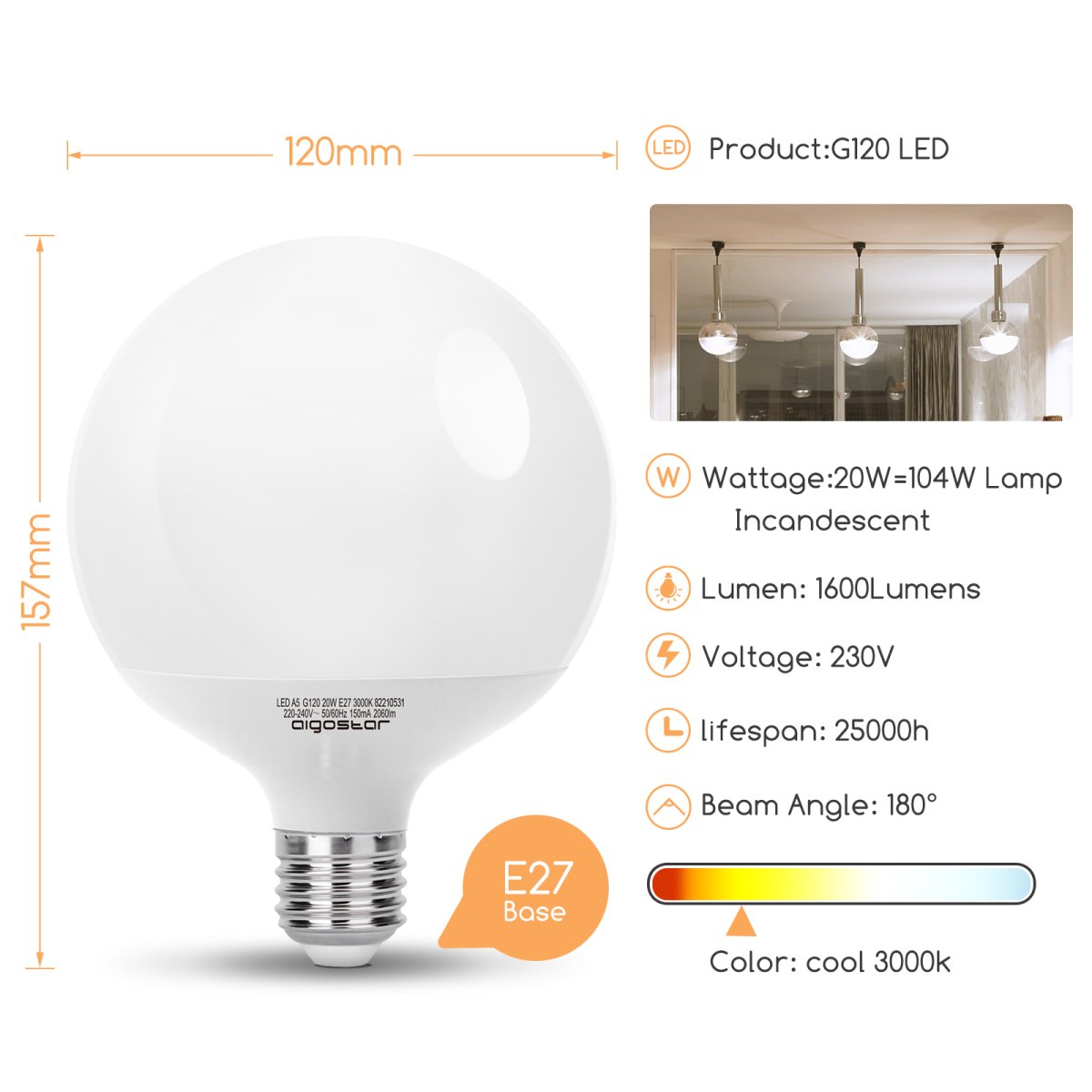 LAMPADINA LED GLOBO 20W (EQUIVALE A 104W) 1600lmn E27, LUCE CALDA