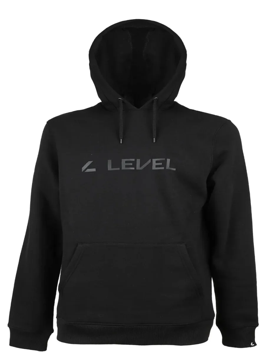 Felpa tinta unita ,nera . Comodi polsini elastici ed elastico in vita antivento, due tasche sul ventre e laccetti per stringere il cappuccio. Un logo posto al centro del petto tinta su tinta.