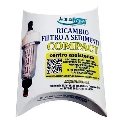 RICAMBIO PER FILTRO SEDIMENTI COMPACT ACQUATRAVEL UTILIZZO Aprire il contenitore Acquatravel Compact ed estrarre il dischetto bianco, facendo attenzione a non perdere l’oring presente sulla testata del filtro. Estrarre il filtro e sciacquare il contenitore Inserire il nuovo filtro, richiudere il contenitore facendo attenzione all’oring, lasciare asciutto il filtro fino al primo utilizzo INFORMAZIONI TECNICHE Marca: Acquatravel Certificazione Alimentare: DM 174/2004 DM 25/2012 Filtrazione: 5 micron