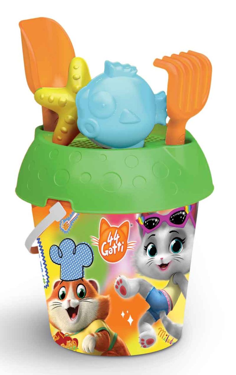 SECCHIELLO 44 GATTI ø18H28 COMPLETO DI FORMINE PIU’ VARI ACCESSORI PER GIOCARE IN SPIAGGIA. PRODOTTO MADE IN ITALY, REALIZZATO IN PLASTICA ATOSSICA RESISTENTE A SOLE, ACQUA