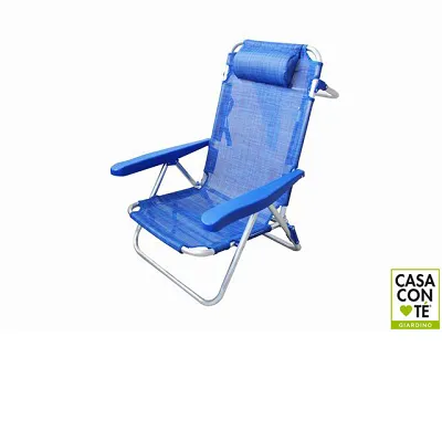 Spiaggina con telaio in alluminio e tela in textilene, reclinabile a più posizioni, terza gamba per tenere sollevato lo schienale quando è completamente reclinato.